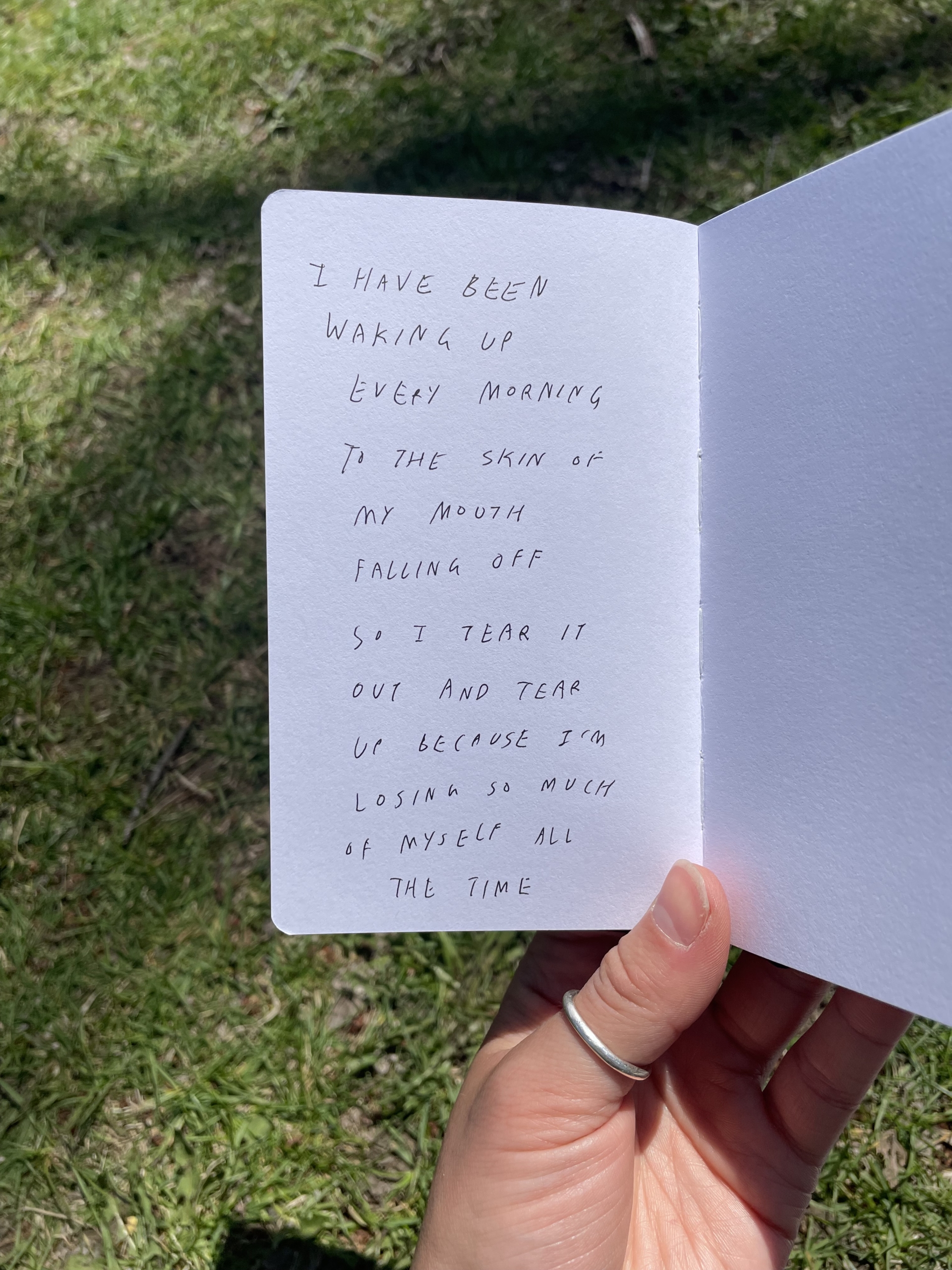 It was January 2022 when I came across Meg’s page on Instagram, I stumbled along a photo of a short piece she had written and tattooed on her arm – after visiting her page I was captivated – her feed was full of written work, poetry and short turns of phrase embodying different states of emotion, posted spontaneously upon creation in photodump form.