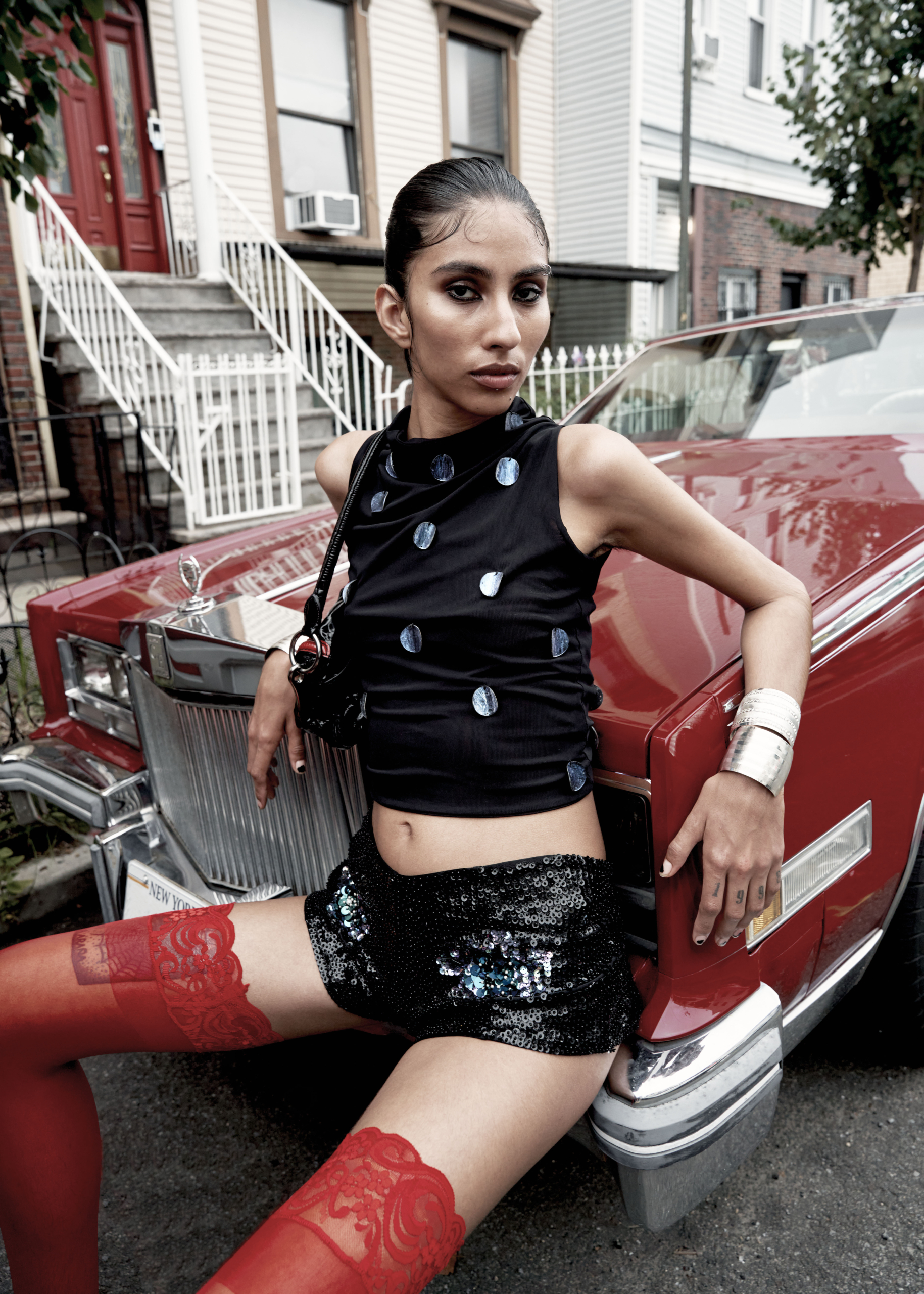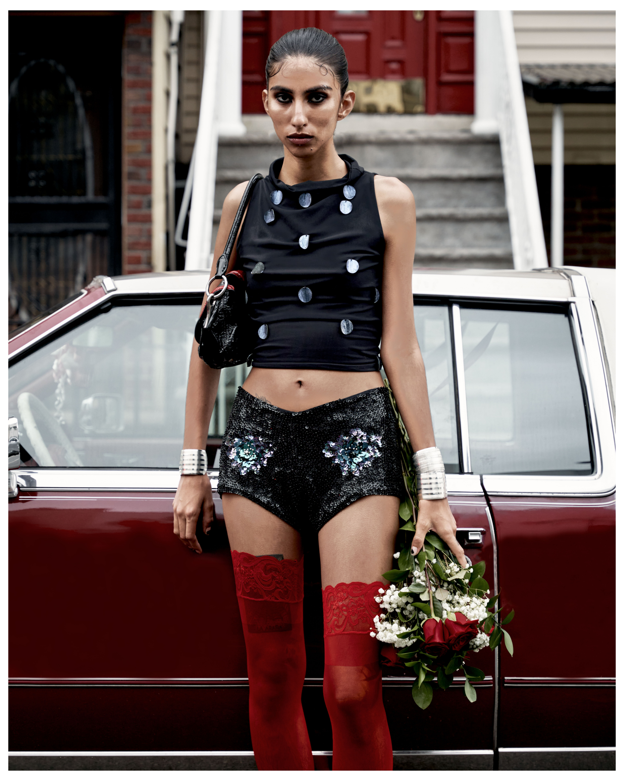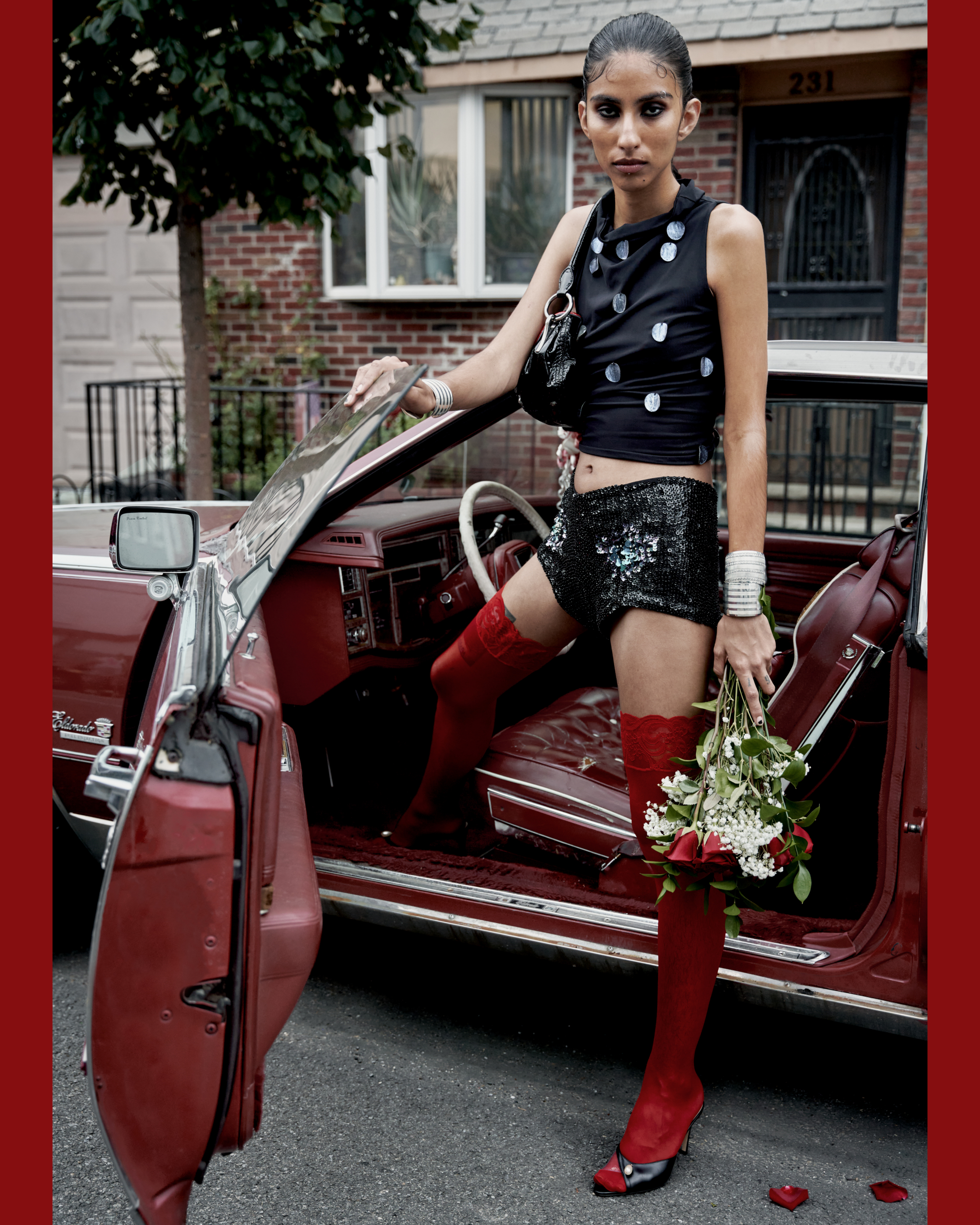 At the heart of the editorial, Valentine Alvarez effortlessly embodies the mysterious allure of a driver navigating the nostalgic streets of New York in a vintage Cadillac. The setting evokes a reimagined scene from A Bronx Tale, yet our protagonist is both refreshed and redefined: of Mexican descent, they bring their own enigmatic personality to the classic tale.