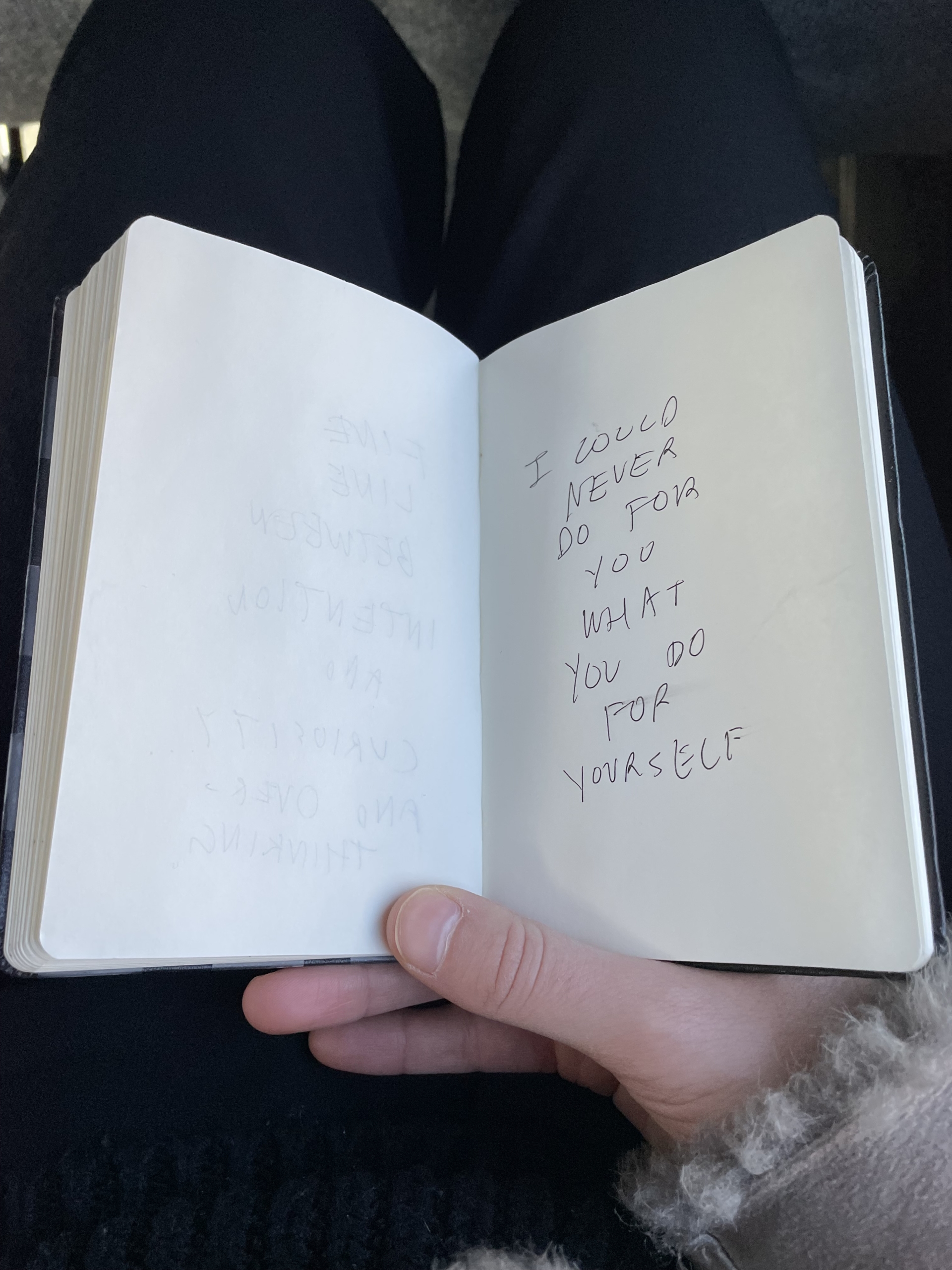 When I asked Meg about her writing process or lack thereof she naturally resonated with the latter, agreeing that her best work is born in an organic and casual fashion, inspired by her surroundings, inner emotions and phrases uttered by the company she keeps. Like any writer, she brings her notebook wherever she goes – setting down her purse on the coffee table before pulling out her little black book to demonstrate her process “it’s just the perfect size” she remarks flipping through the pages covered in scrawls of written work.