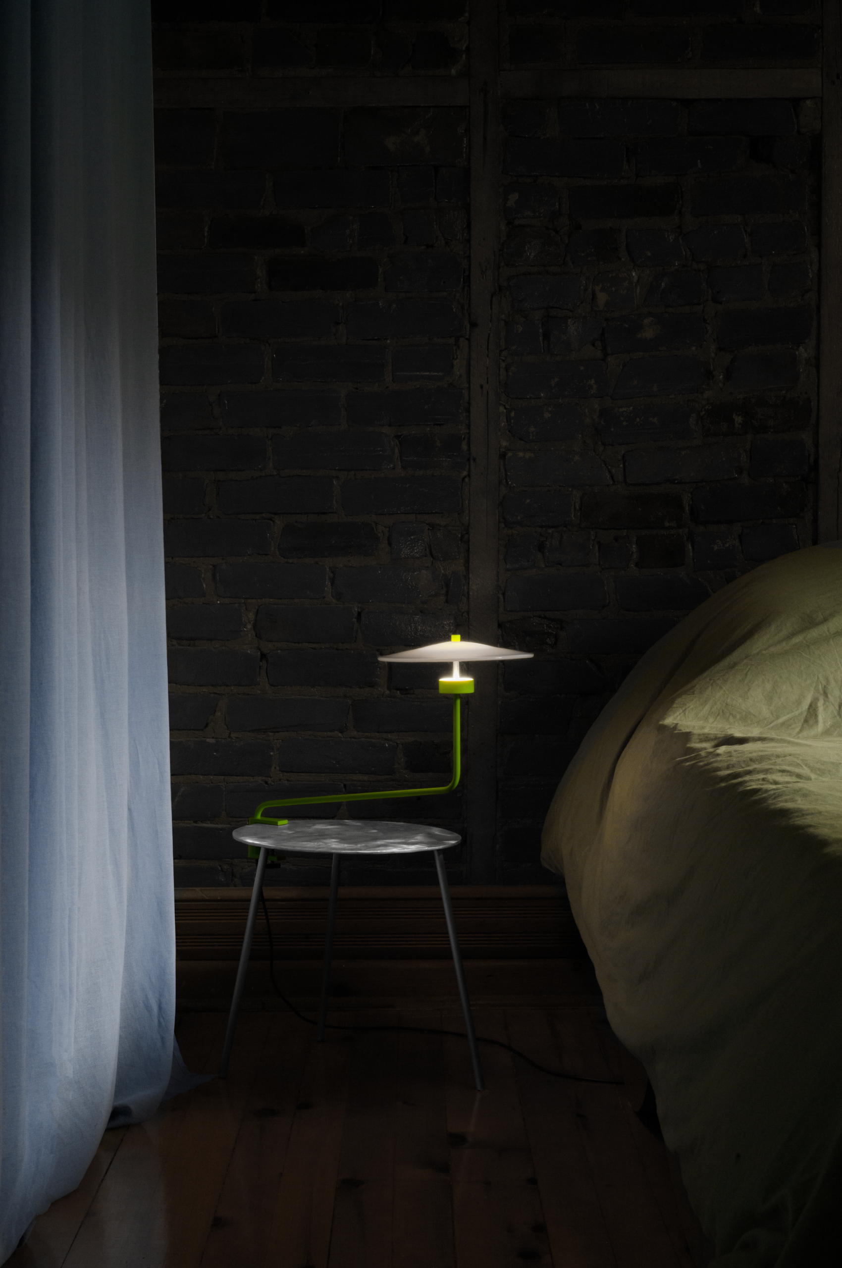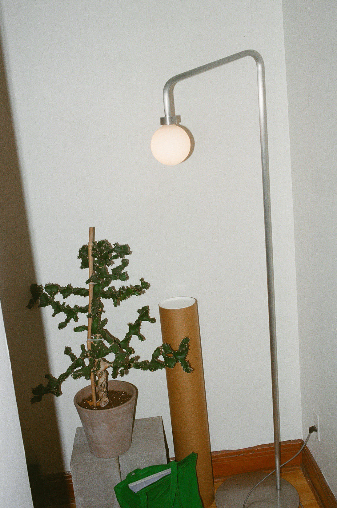 There are pieces offered in the collection that are specialized by individual members of the collective, such as the Mesito tables done by Julia or the Espejo mirrors, designed by Muriel. Yet, most of the work is done as a collective, like the jestful Dice stools made from Canadian maple, and the Construction I lamp that left me with an insatiable desire to see it clipped on my writer’s desk. The Rubber Libraries are inky, black shelving made from the synthetic material and held together by rivets that challenge the conception of what materials can create beautiful pieces for the home. Constructed with methods used for forming jeans, the synthetic rubber, often associated with being discarded, becomes a strong yet playful, bubbly, and functional cubby. Much like their Nao lamps, which take such an overtly “outside” and ordinary design, Atelier Fomenta builds pieces that are, as they describe, slightly ironic yet functional. The aluminum Nao lamp extracts the nostalgia and liminality of the singular street lamp and offers it to the home.
