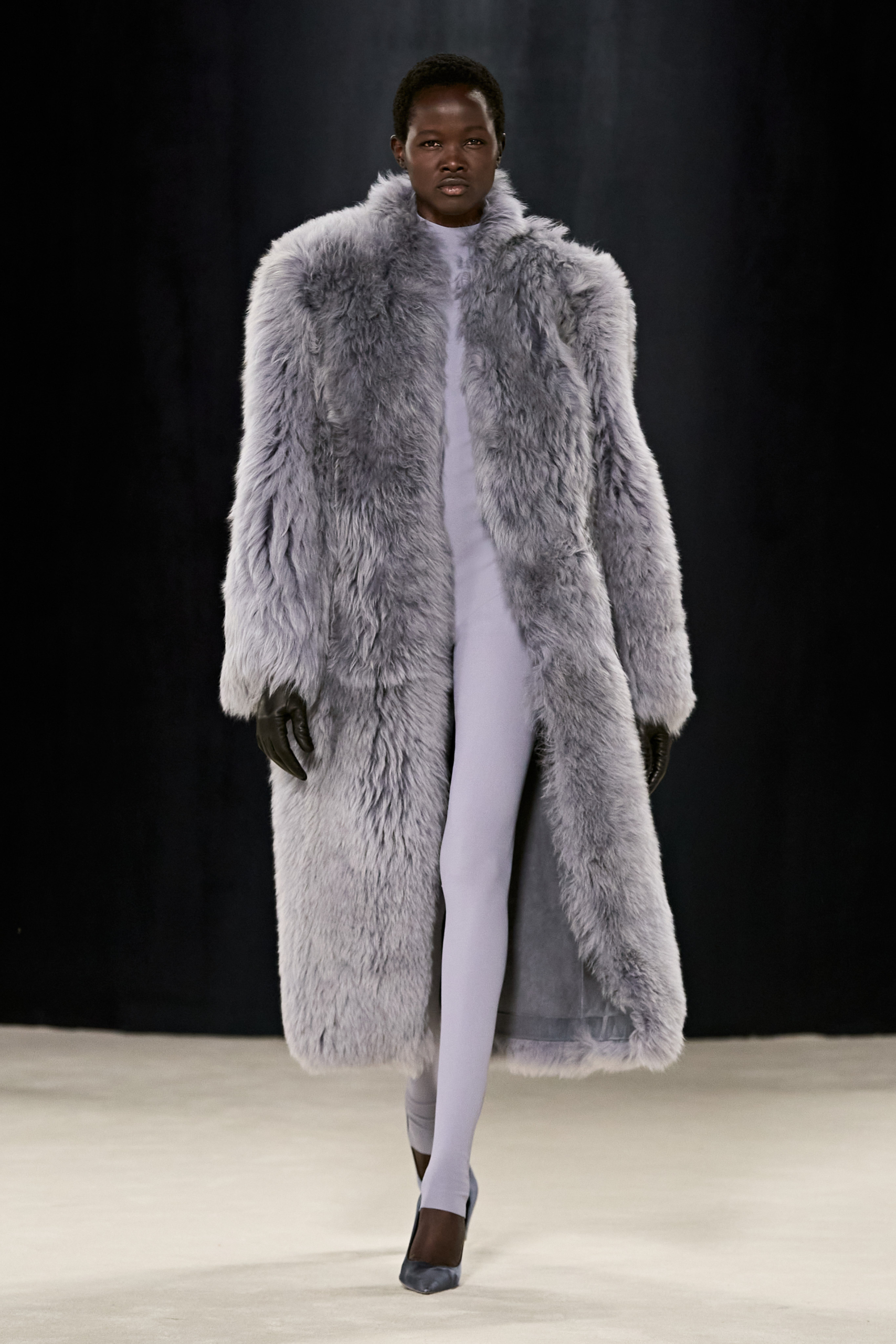 As far as the brand’s business goals are concerned, CEO Marco Gobetti is bullish about turning those rarely memorable handbags into cash cows. Ditto the shoes in that regard. Looking at how Davis fared in the accessories department, there were extremely pointed ankle strap pumps and rope chain stilettos. There were also navy patent mules and a red satin version, lucite necklaces paired with matching top-handled bags, and almost all looks featured Schiaparelli-esque golden orb earrings.