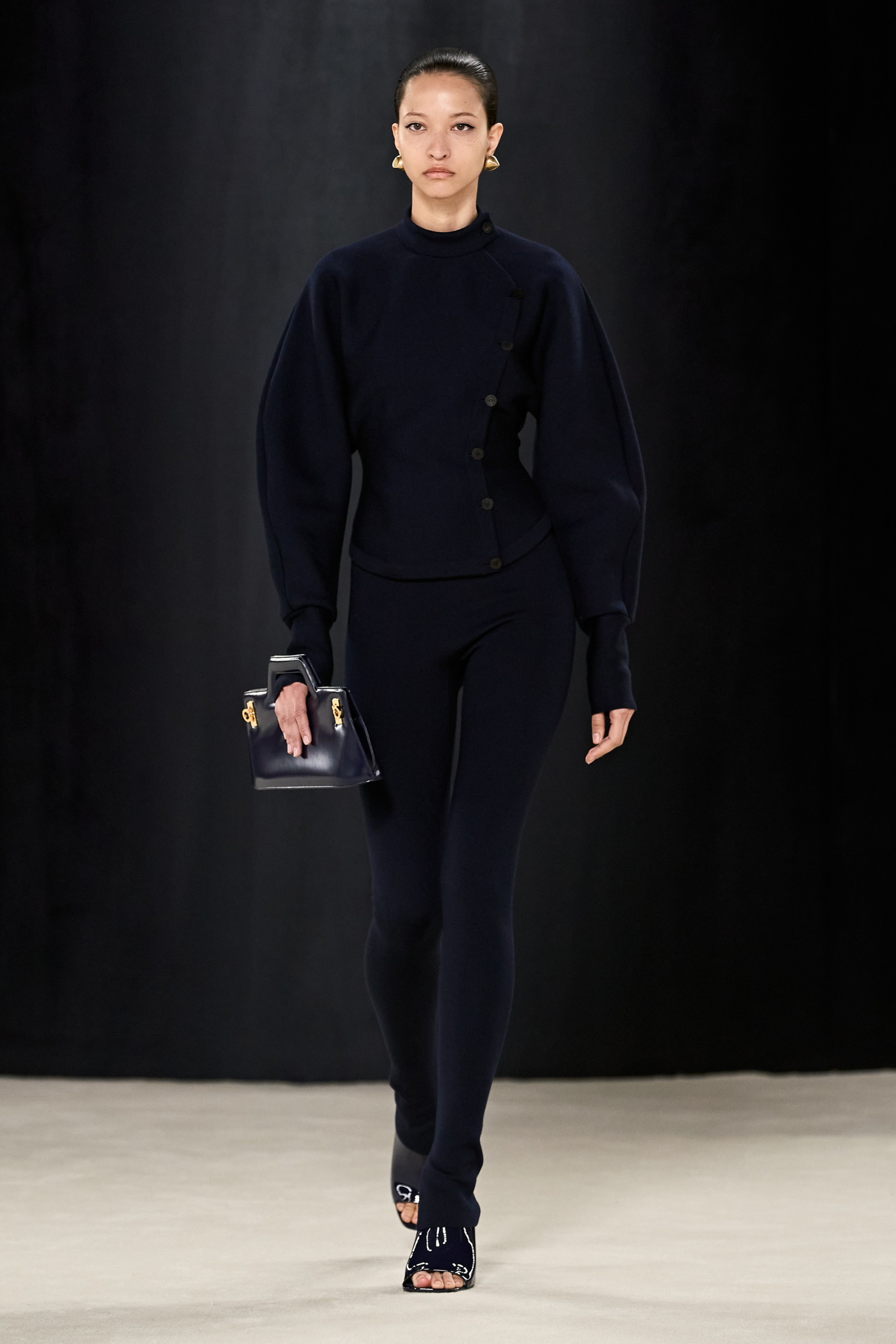 In the opening looks, black and navy motifs were combined to enhance handbags and shoes, which were further accentuated by crisp tailoring. Davis has access to the finest leathers and suedes at Ferragamo, but his clean sophisticated designs resist the temptation to show off, and while at times they were relatively straightforward, subtlety and craft still dominated.