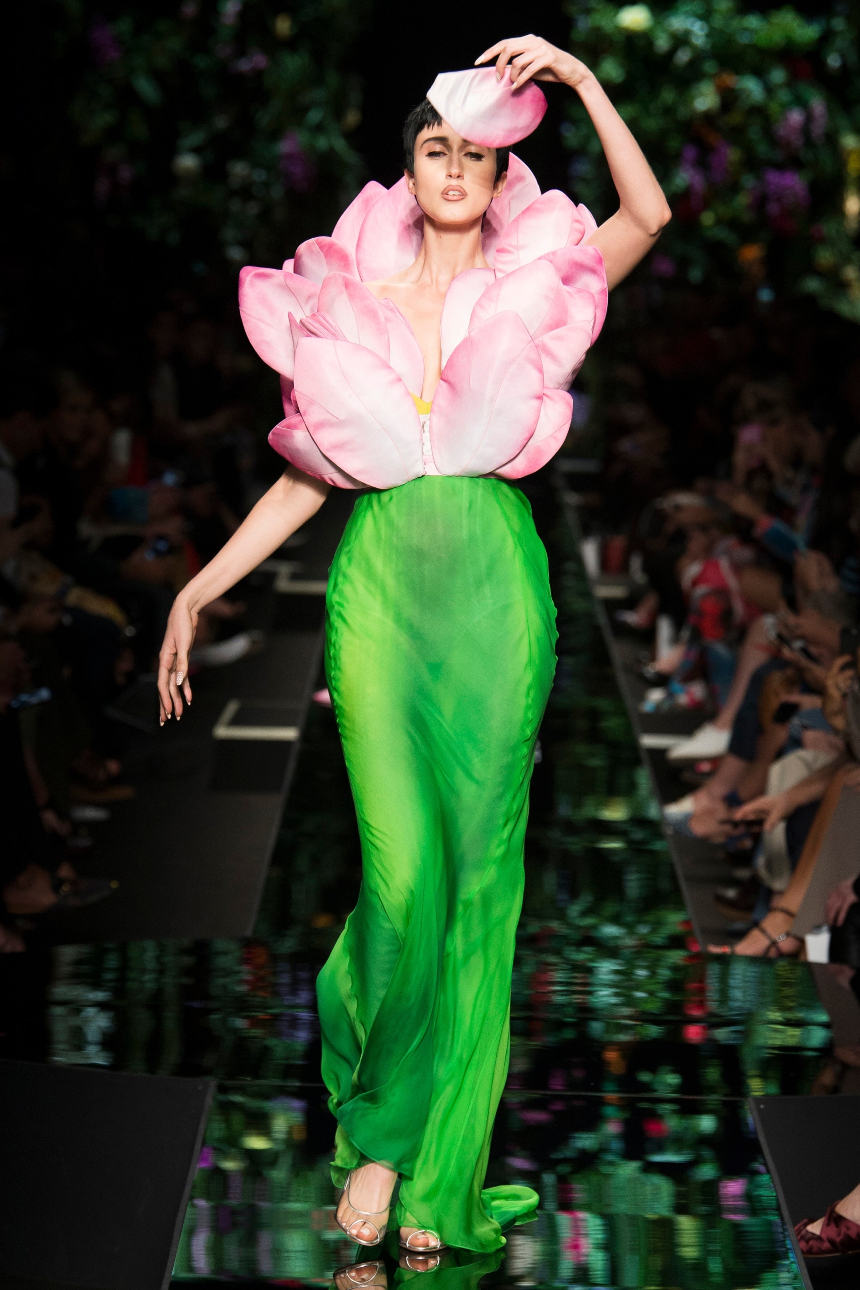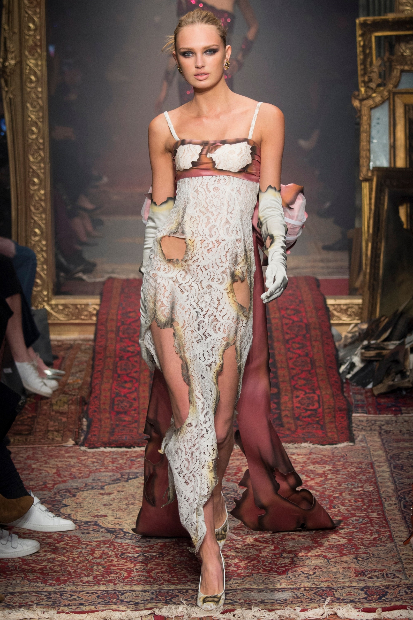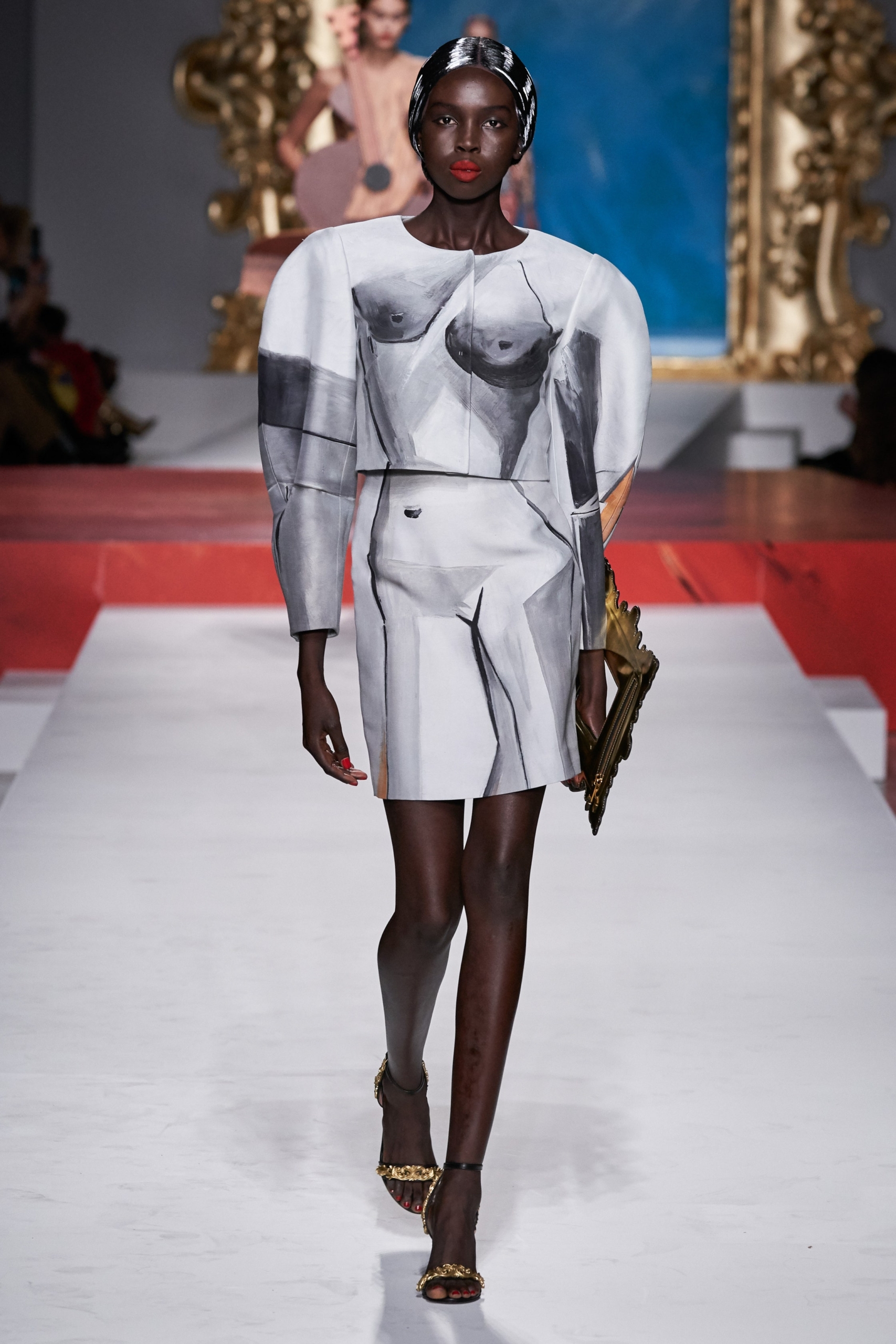 Through his residency as creative director, Scott sent many impactful collections down the runway, his early works at Moschino incorporated Mcdonald’s graphics and cow prints, and the ever-so-iconic Moschino Barbie Girl. Other tongue-in-cheek references emerged through the late 2010s including the ‘Valley of the Dolls’ collection which sent what looked like life-size paper doll clothing down the catwalk, and the 2018 floral-inspired collection where Gigi Hadid emerged as a wrapped bouquet of wildflowers. More recently, Scott has interpreted Marie Antoinette-era garb in denim and leather, put on an elaborate puppet show (with seated marionette attendees) during Covid-19 lockdowns, and explored his dark side in 2023 with noticeably darker palettes.
