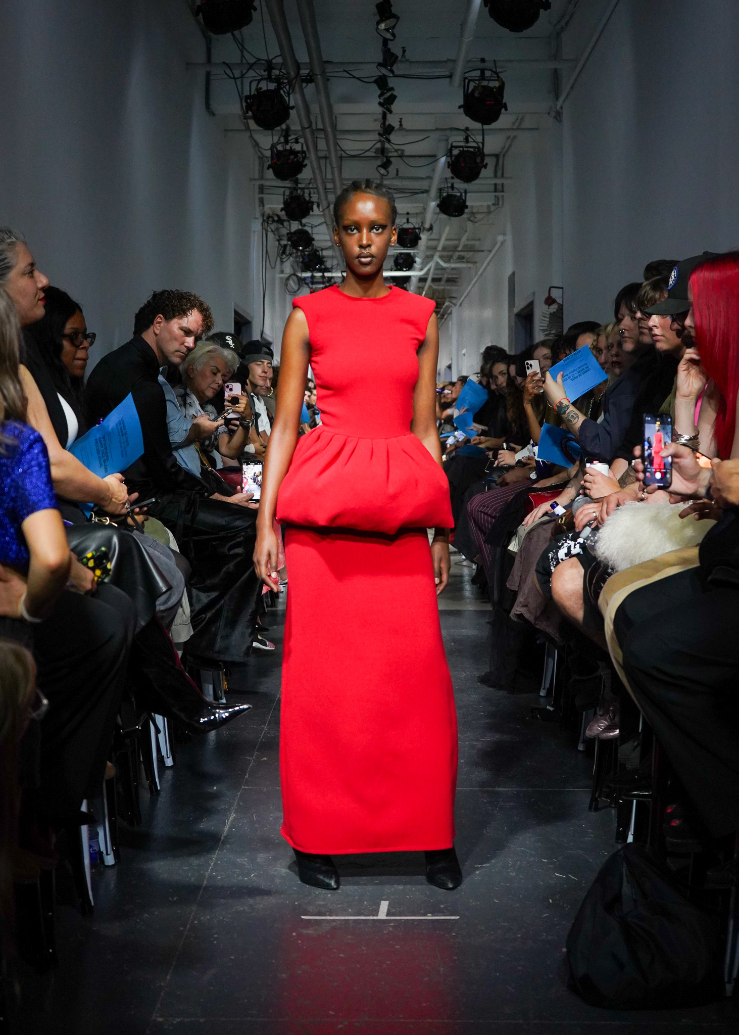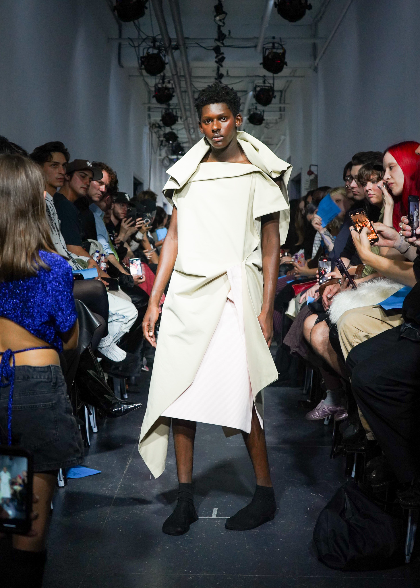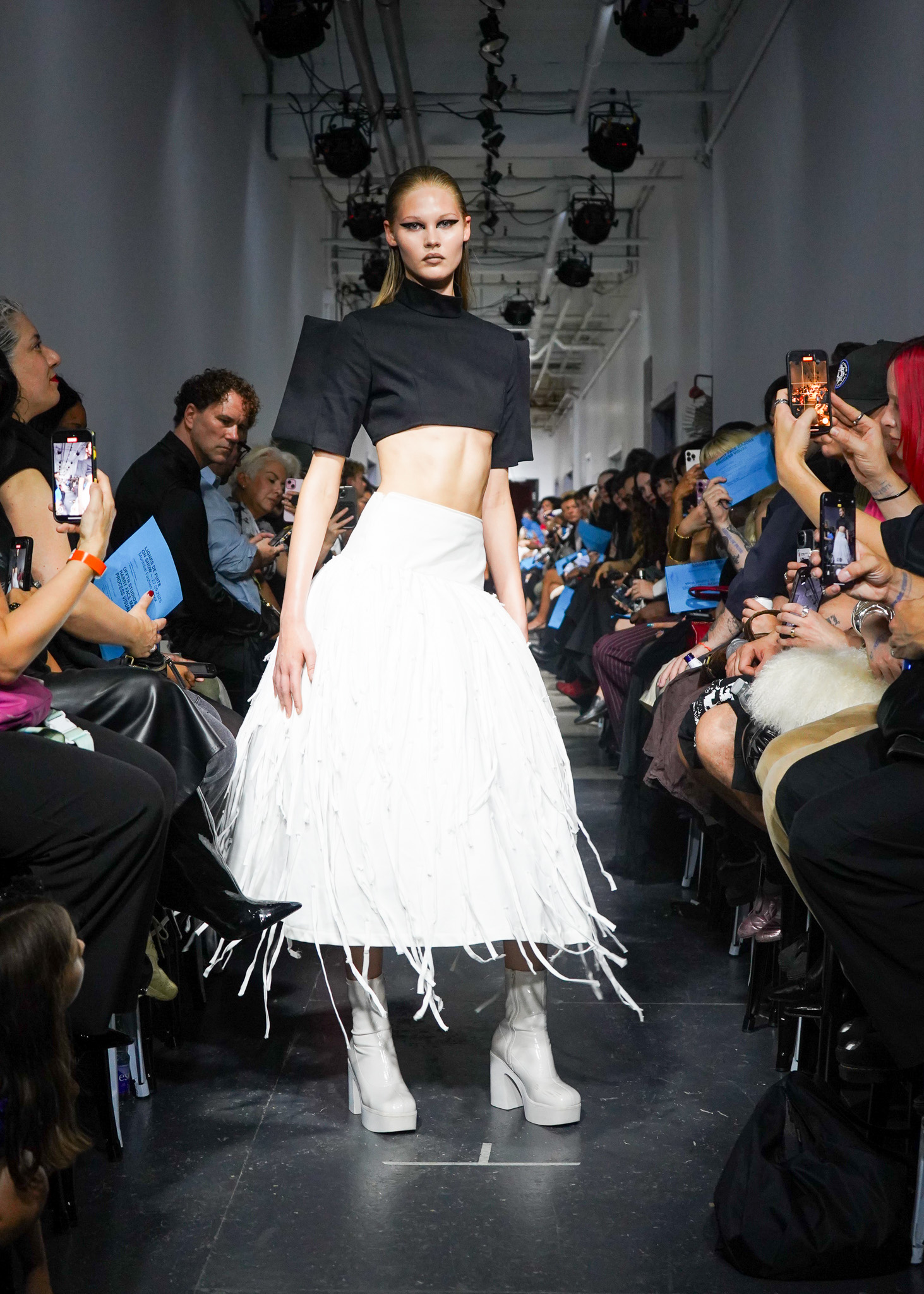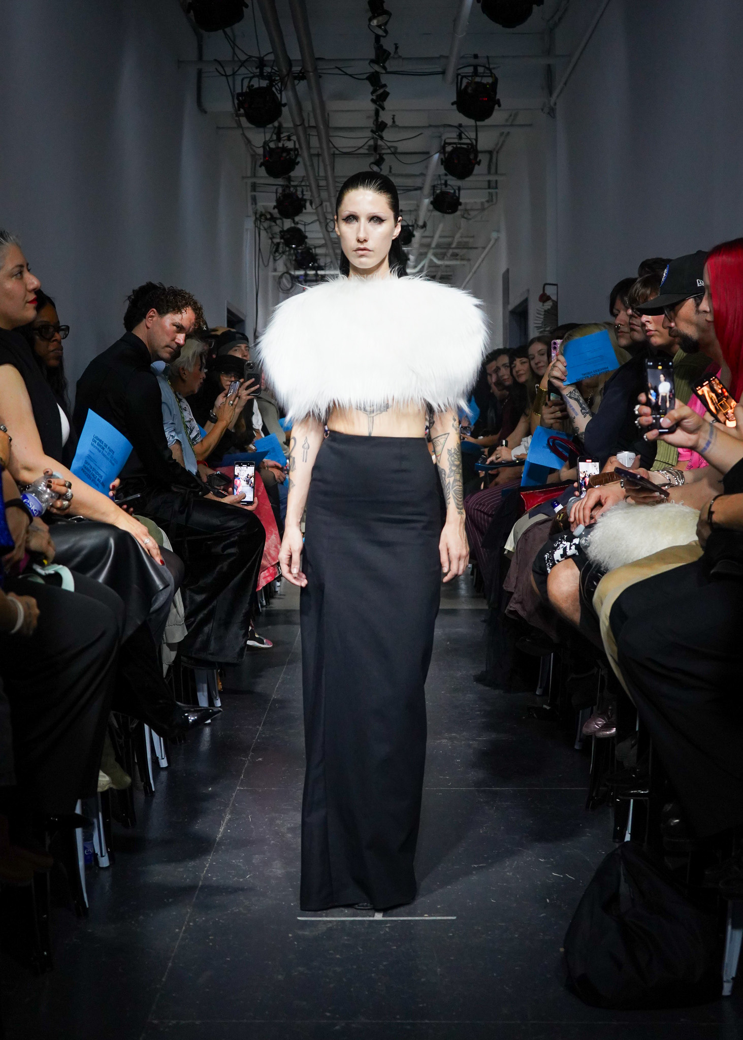 OFFTN staged a study in stark geometry and sculptural form this season at Lignes de Fuite. The show oscillated between razor-sharp minimalism and surreal exaggeration, anchoring its language in a palette of black, white, and red. Cropped jackets and high-waisted skirts were squared into rigid silhouettes, their severity offset by textural plays, zebra stripes, faux-fur tufts, and exaggerated padding. The collection’s most striking gestures came in its warped volumes: bulbous hips carved into red wool, balloon hems suspended in air, a black puff mini orbiting beneath an oversized circular hat. Elsewhere, a white skirt bristling with trailing cords evoked shredded fringe, caught between disarray and control. The effect was at once futuristic and primal, silhouettes stripped of ornament yet thrumming with excess.