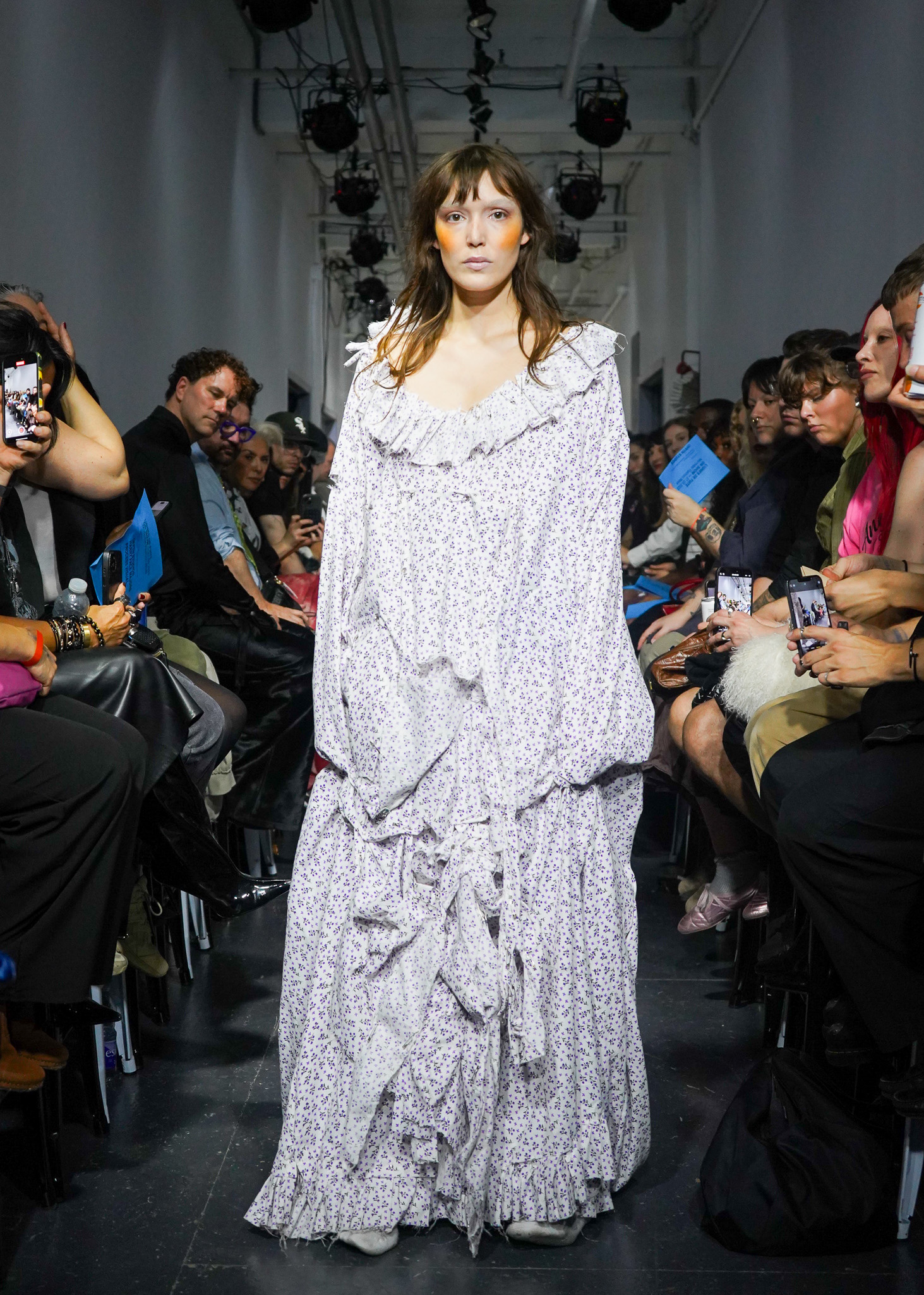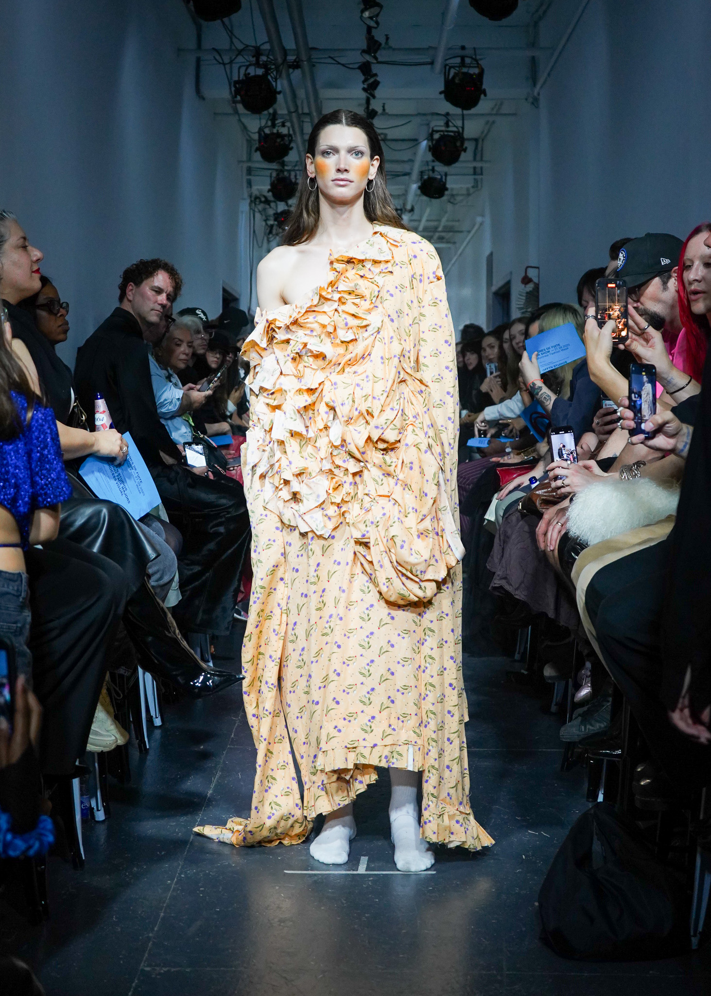 At Lignes de Fuite, Harry Face Majors offered a vision that felt like both a love letter and an autopsy to romance. Cascading ruffles, oversized florals, and diaphanous silhouettes floated down the runway, saturated in shades of pink, yellow, and green juxtaposed against stark blacks. It was a pastoral fantasy deconstructed, at once in a state of becoming and undoing. At first glance, the collection read idyllic in its looseness and colour palette, but closer inspection revealed seams undone and sutured with safety pins, saturated colors breaking against stark blacks. It was disassemblage not as destruction, but as tenderness fractured, an exploration of beauty held together by precarious stitches.