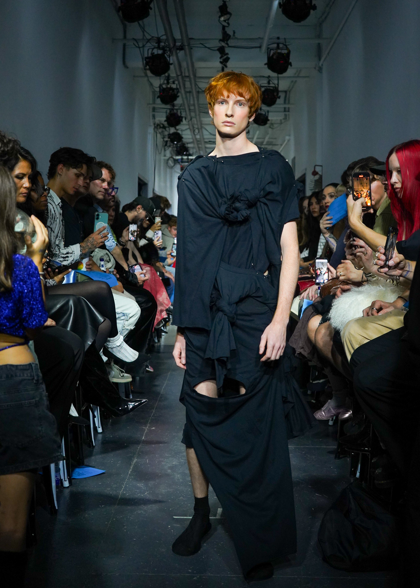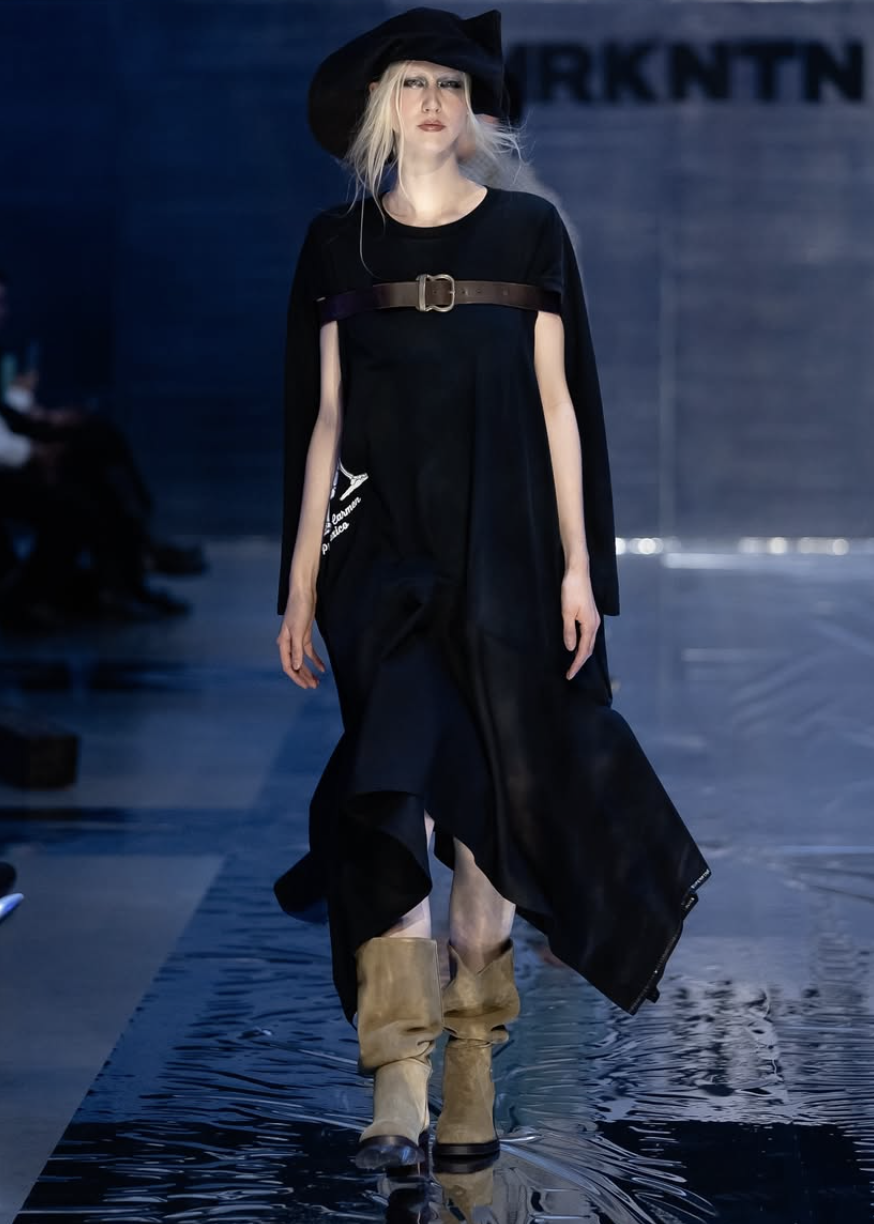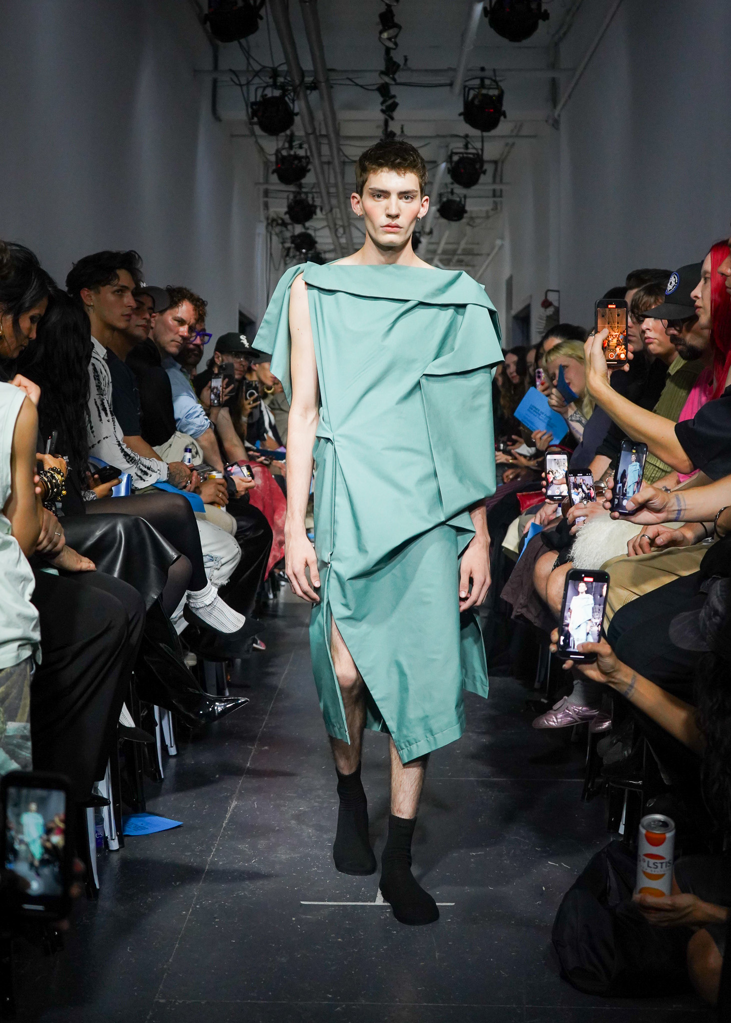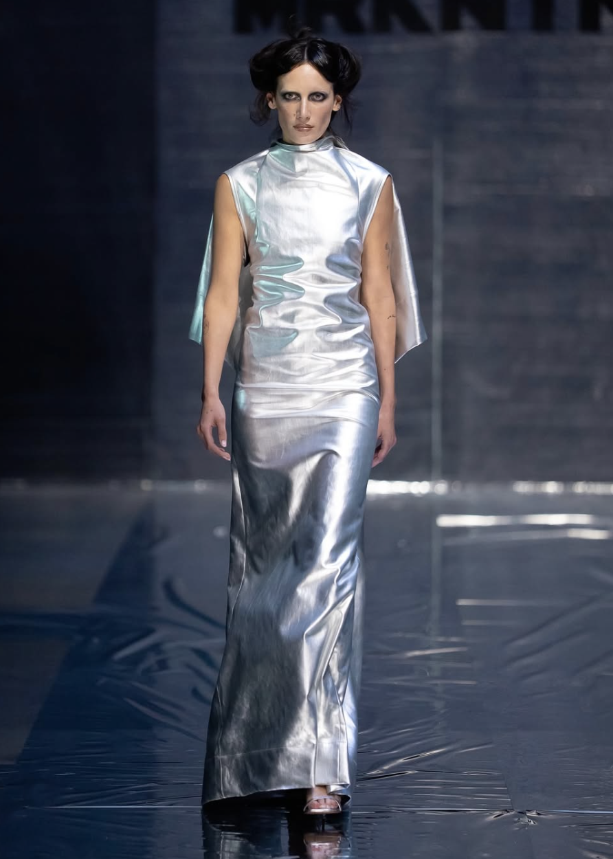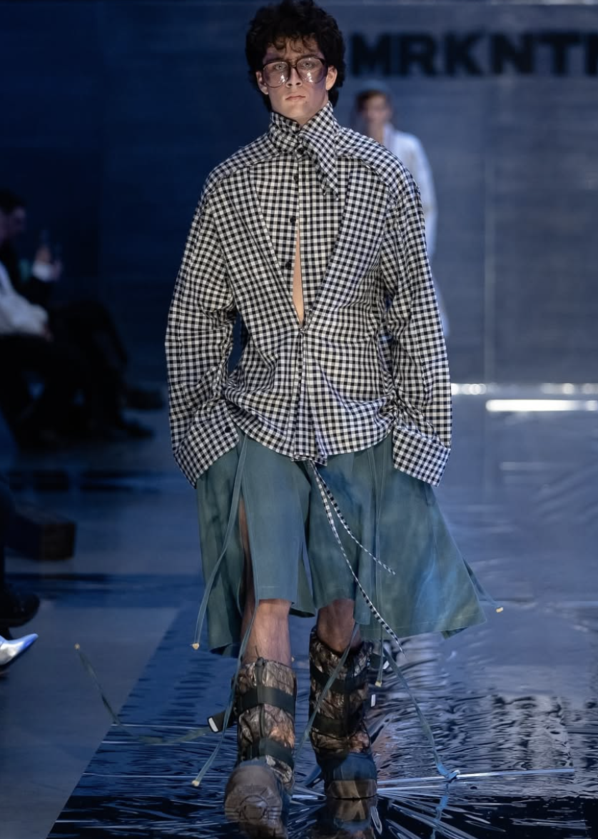 At MRKNTN, the runway, set against the backdrop of the St. Lawrence at the Grand Quai du Port de Montréal, became an exercise in contradiction: a silver floor gleaming under industrial beams, punctuated by monumental rocks, set the stage for garments that oscillated between fragility and armour. Distressed plaids, shredded skirts, and oversized tailoring rubbed against iridescent silks and hand-dyed fabrics in muted aquas and pinks. Boots padded like protective gear grounded the collection, while raw hems and exposed seams leaned into disarray. Yet within that chaos, there was a clear architecture, a sense of garments cut to protect as much as to reveal. MRKNTN distilled the contradictions of contemporary Montréal style into a show that felt both vulnerable and defiant, an homage to Quebec’s raw landscapes and working-class mythologies, filtered through the subcultural lens of skatewear and street couture.